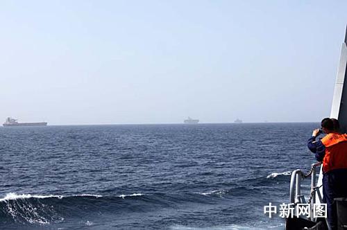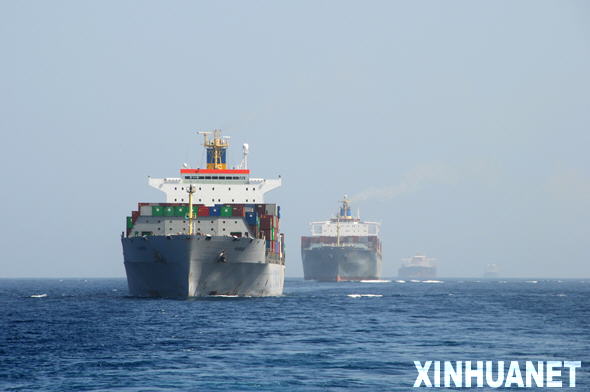 1月6日,中國海軍艦艇編隊抵達亞丁灣海域,正式開始護航。圖為在“海口”艦上所拍商船呈一字縱隊,在軍艦護送下前行。中新網孫自法 攝