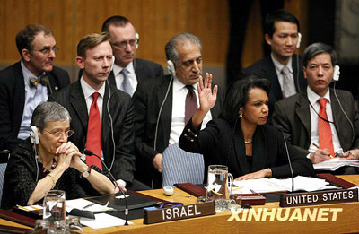 1月8日,在美國紐約聯合國總部,美國國務卿賴斯(前右)在安理會表決時舉手投棄權票。前左為以色列常駐聯合國代表沙萊夫。