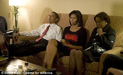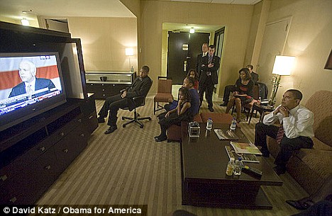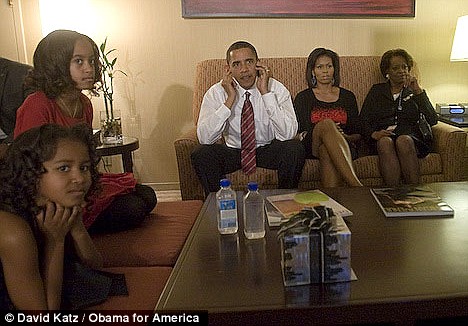 奧巴馬身居芝加哥賓館房間,在觀看大屏幕上麥凱恩發(fā)表承認(rèn)競(jìng)選失敗的演講時(shí)凝神靜聽(tīng),多數(shù)時(shí)間顯得很?chē)?yán)肅,正很符合他“不搞噱頭的奧巴馬”的稱(chēng)號(hào)。奧巴馬把雙腳放在咖啡桌上,顯然也已疲憊不堪,圖片為22個(gè)月的競(jìng)選之路即將勝利結(jié)束之時(shí),奧巴馬和他的家人關(guān)注競(jìng)選結(jié)果的揭曉。