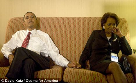 支持:奧巴馬緊握著岳母瑪麗亞-羅賓森的手。
