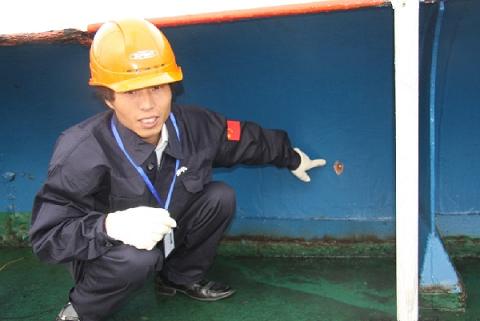 船員方濤指著甲板上的彈孔說,當(dāng)時戰(zhàn)斗很激烈。(來源:新民晚報 崔健 攝)