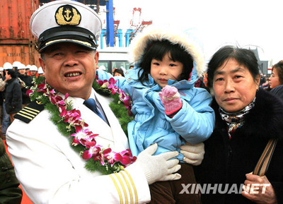 1月23日,“振華4輪”船長彭維源(左)和家人在歡迎儀式上。