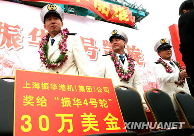 中國日報網環球在線消息:1月23日,上海振華港機(集團)股份有限公司在上海長興島基地舉行歡迎儀式,迎接“振華4輪”凱旋,對在亞丁灣擊退索馬里海盜襲擊的30名英勇船員進行表彰,并給予30萬美元獎勵。