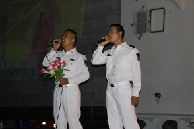 ![]() 武術表演。(中國日報特派記者王輝攝) 中國日報網環球在線消息:舉辦“祝福祖國”春節聯歡晚會、吃一頓熱熱鬧鬧的年夜飯,中國海軍護航官兵在印度洋亞丁灣度過了一個快樂祥和、別具特色的2009年新春佳節。 “祝福祖國”春節聯歡 1月24日晚,“海口”艦后甲板燈火輝煌,笑聲、掌聲、歌聲交織在一起,護航官兵們在這里舉行了熱熱鬧鬧的“祝福祖國”春節聯歡晚會。 晚會首先在慷慨激昂的詩朗誦中拉開了序幕,“海口”艦指揮組成員在詩朗誦中回顧了護航以來的點點滴滴,贊頌護航官兵日夜值勤、戰風斗浪,贏得了被護商船船員的稱贊。 隨后,護航將士一曲蕩氣回腸的小合唱《精忠報國》,展現了護航官兵們保衛海上航線、捍衛國家尊嚴的壯志豪情。一首動人的《長江之歌》伴著亞丁灣的滾滾濤聲將護航官兵的心帶向美麗的祖國。 特戰隊員的武術表演更是虎虎生威,博得了一陣熱烈的掌聲。別具特色的現代舞表演則展現了護航官兵們的青春活力與激情。一曲《歡樂中國年》為護航官兵帶來喜慶的過年氣氛。 最后,護航官兵全體起立,高唱《歌唱祖國》,嘹亮的歌聲激蕩在印度洋上空,越過高山大海,飄向長江黃河,祝福偉大的祖國繁榮富強,全國人民幸福安康。 年夜飯:八菜一湯 大年三十,護航官兵們吃什么年夜飯呢?帶著這個問題,我走訪了“海口”艦炊事班,了解情況。 炊事班李偉向我介紹說,大年三十晚上,全艦官兵會餐,八菜一湯。一湯是“鮑魚白蘿卜湯”,八菜分別是“椒鹽蒸蝦”、“清蒸海鯉”、“燉羊肉”、“香酥雞”、“四喜丸子”、“上湯大白菜”、“醋溜土豆絲”和“涼拌粉絲”。 李偉表示,這頓印度洋上的年夜飯不僅好吃,而且色香味俱全,一定要讓護航官兵們一看就胃口大開,吃好這頓不同尋常的年夜飯。 (中國日報特派記者王輝)