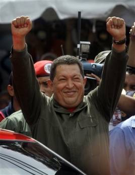2月15日,委內(nèi)瑞拉總統(tǒng)查韋斯離開(kāi)投票站時(shí),做出勝利手勢(shì)。