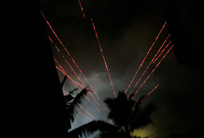 2月20日,斯里蘭卡首都科倫坡上空,軍方發射防空炮火點亮了夜空。