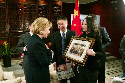 希拉里接受中國日報網贈送的禮物,圖為1998年她作為總統夫人與前總統克林頓訪華時的照片