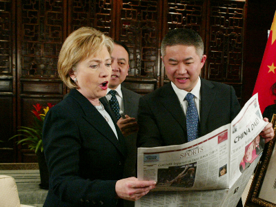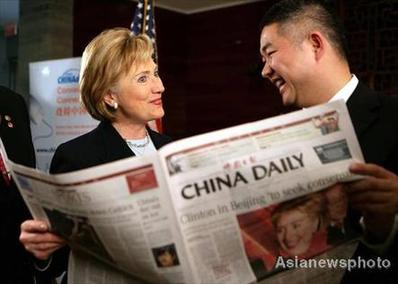 中國日報新聞中心主任孫尚武(右)向希拉里介紹《中國日報》