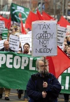 據英國《泰晤士報》22日報道,觸發此次示威游行的導火索是愛爾蘭政府出臺的一項計劃。根據該計劃,政府將對公務員等工薪階層人士征收重稅。愛爾蘭從去年9月就進入經濟衰退,為了應對金融危機,愛爾蘭總理考恩擬訂了一套削減政府20億歐元開支的計劃,希望能夠穩定曾有“凱爾特之虎”美名的愛爾蘭經濟,這其中包括從今年起對35萬公務員征收退休金稅和年金稅的計劃。據統計,這樣政府每年可征得14億歐元稅款,而中低層公務員的年收入要減少至少2800歐元。