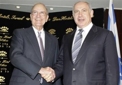 2009年2月26日,美國中東問題特使喬治?米切爾(左)與以色列利庫德集團主席內塔尼亞胡在特拉維夫舉行會談之前握手。(圖片來源:美國媒體)