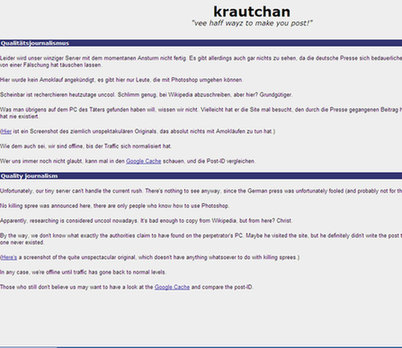 Krautchan網(wǎng)站和其用戶馬上否認這一傳聞,并指出這一消息是偽造的圖像文件,它首次出現(xiàn)在Krautchan網(wǎng)站上是在克雷奇默自殺3個多小時以后。該網(wǎng)站的一位版主Tsaryu說:“我知道是誰上傳了它,他來自杜塞爾多夫。那與巴登-符騰堡州的距離并不近。”Tsaryu還指出,德國媒體早前報道克雷奇默在作案前曾與名為貝恩德的朋友交談,其實根據(jù)Krautchan網(wǎng)站協(xié)議,網(wǎng)上進行的所有交流都是匿名的,每一位用戶都使用同一個名字——貝恩德。