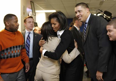 中國日報網環球在線消息:據英國《每日電訊報》報道,3月12日,美國總統夫人米歇爾·奧巴馬探訪美國一處軍事基地,這是她首次以“第一夫人”的身份離開首都華盛頓赴地方訪問。在第二天的電視專訪中,奧巴馬夫人描述了自己在聽到一些軍人家庭依靠食品券為生時的“痛心”,并承諾今后要為改善軍屬待遇出力。