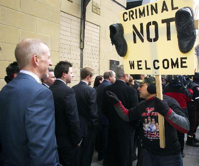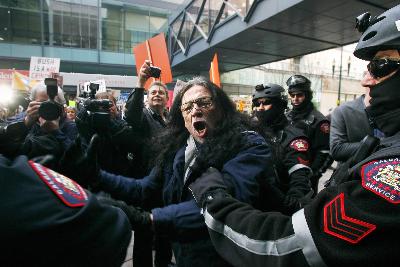 據(jù)報(bào)道,被警察逮捕的一名男子表示,他試圖進(jìn)入演講會(huì)場(chǎng)“逮捕布什”。他稱“布什犯下謀殺罪行”,被捕時(shí)他還不斷高喊“逮捕布什”。眾多示威群眾舉著“對(duì)美國(guó)違反人道的罪行說不”,“以戰(zhàn)爭(zhēng)罪犯名義起訴布什”,“加拿大不是布什國(guó)”等標(biāo)語(yǔ),在布什演講場(chǎng)地大樓外示威。