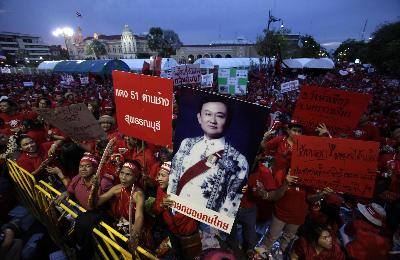 26日集會的當晚,流亡海外的他信通過電話連線致電“紅衫軍”。當時,他信正在前往非洲的一架飛機上。