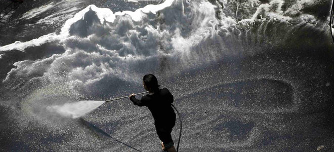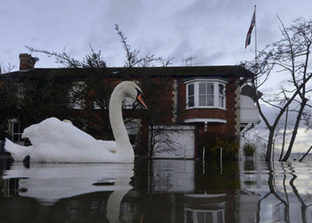 1月13日,在英國南部泰晤士河畔亨利,一只天鵝游過部分被洪水浸入的房屋。 自去年12月以來,英國有超過1700座房屋與商店遭受洪水沖擊。洪水還造成7人死亡。