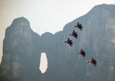 “俄羅斯勇士” 特技飛行隊的5架蘇-27重型戰斗機在張家界天門山國家森林公園試飛成功。