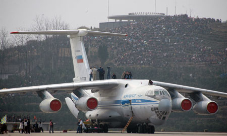 2006年3月17日下午,俄羅斯空軍“俄羅斯勇士”特技飛行隊(duì)首場(chǎng)表演在湖北省張家界市舉行,5架蘇-27戰(zhàn)斗機(jī)進(jìn)行了編隊(duì)特技、單機(jī)特技等表演。當(dāng)?shù)財(cái)?shù)萬群眾從不同角度爭(zhēng)相觀賞。(來源:新華社)