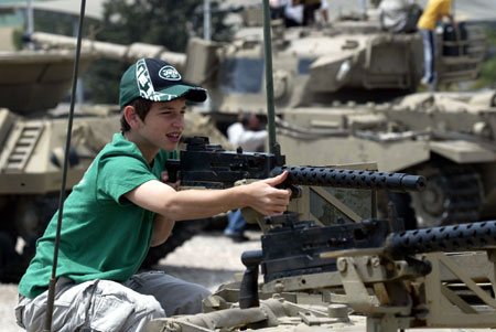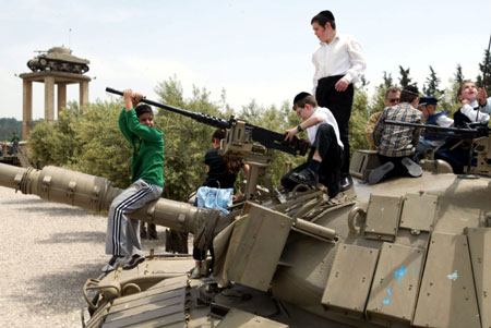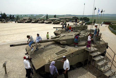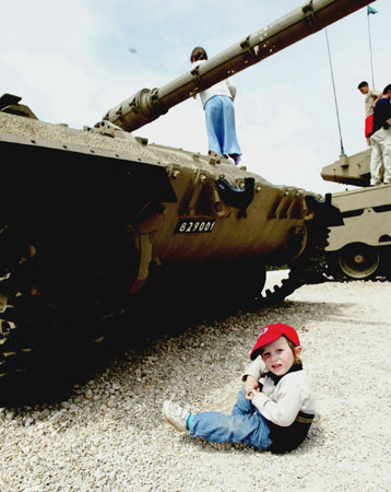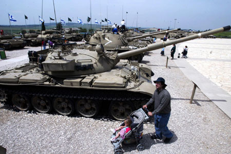 4月18日,以色列人在逾越節假期里參觀萊特龍軍事博物館。這個博物館位于耶路撒冷與特拉維夫之間的萊特龍,陳列了包括以色列著名的主戰坦克“梅卡瓦”在內的各種型號的坦克和裝甲車。本月12日到19日是猶太傳統節日――逾越節的假期。按照以色列的規定,在法定節假日期間,所有博物館都免費向游客開放。(圖片來源:新華社)