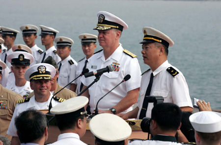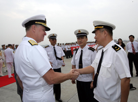 中國海軍南海艦隊副參謀長林永青(前右)在碼頭迎接美國海軍太平洋艦隊司令拉夫黑德(前左)