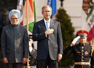 美國總統布什(中)在華盛頓舉行儀式歡迎印度總理辛格(左)的到訪。[法新社照片]