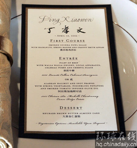 蓋茨宴請(qǐng)胡錦濤主席的菜單(美聯(lián)社圖片)