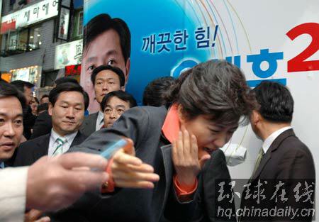 環球在線消息:韓國最大的反對黨、大國家黨代表樸槿惠5月20日遭襲,右臉被割傷,傷口長達11厘米。大國家黨呼吁韓國警察廳長李宅淳引咎辭職。韓國總統盧武鉉5月21日下令警方與檢察機關對此進行聯合調查。