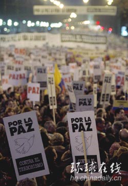 據(jù)英國(guó)媒體報(bào)道,在馬德里,游行民眾舉著“要和平、要生命、要自由,反對(duì)恐怖主義”的標(biāo)語(yǔ)牌,浩浩蕩蕩經(jīng)過(guò)城市中心,很多人手舉標(biāo)語(yǔ),默默無(wú)聲地進(jìn)行著抗議。據(jù)馬德里市政府估計(jì),大約有21萬(wàn)人參加了這次游行隊(duì)伍,