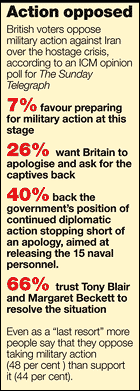 英國政府爭取用外交手段解決“水兵危機(jī)”的做法也得到了英國民眾的認(rèn)同。《星期日電訊報》刊登的一項民意調(diào)查顯示,絕大多數(shù)英國民眾不希望采取軍事行動來解決扣押事件。