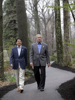英國媒體報道說,戴維營的這次秘密會談持續了約一個小時。會議結束后,布什還親自開車,與安倍一同前往新聞發布會場。