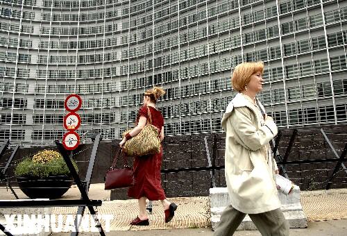 6月21日,在比利時首都布魯塞爾,行人從歐盟總部前的路障旁走過。當晚,歐盟首腦會議將在這里開幕,商討歐盟憲法新條約等問題。