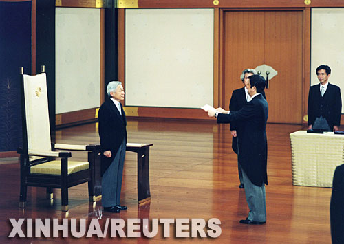 2006年9月26日,日本新首相安倍晉三(前右)在首都東京的皇宮接受明仁天皇(前左)的任命書。當天,安倍晉三當選第90任日本首相。新華社/路透