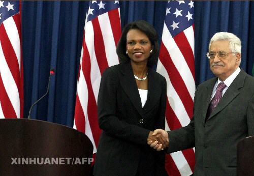 9月20日,在約旦河西岸城市拉姆安拉,巴勒斯坦民族權力機構主席阿巴斯(右)與來訪的美國國務卿賴斯共同出席新聞發布會。賴斯于當天抵達拉姆安拉,繼續其9月19日開始的以巴地區訪問行程。新華社/法新