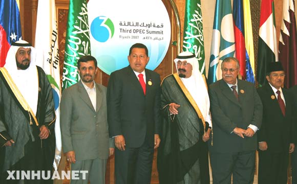11月17日,阿聯酋總統哈利法、伊朗總統艾哈邁迪-內賈德、委內瑞拉總統查韋斯、沙特國王阿卜杜拉、伊拉克總統塔拉巴尼、印尼副總統尤素夫(從左至右)等歐佩克成員國的首腦在第三屆歐佩克首腦會議上合影。第三屆石油輸出國組織(歐佩克)首腦會議當天在沙特阿拉伯首都利雅得開幕。新華社記者李震攝