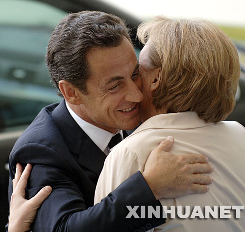 5月16日,德國總理默克爾(右)在首都柏林的總理府歡迎到訪的法國新任總統薩科齊。當日,薩科齊正式就任法國總統,在就職典禮的各項活動結束后,薩科齊前往德國訪問。新華社記者 吳曉凌