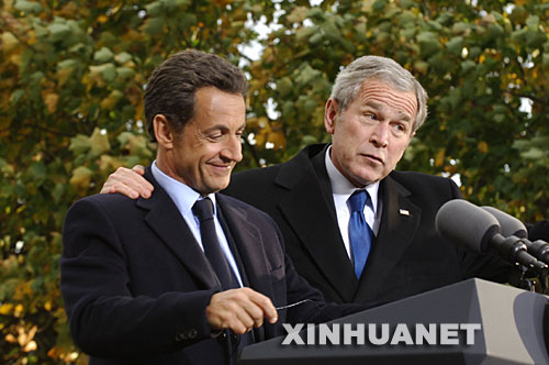 11月7日,美國總統布什(右)與來訪的法國總統薩科齊在弗吉尼亞州的華盛頓故居――芒特弗農舉行會談并舉行聯合記者會。新華社記者張巖攝