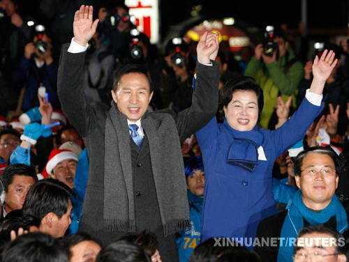 12月19日,在韓國首都首爾的大國家黨總部,大國家黨總統(tǒng)候選人李明博(左)與夫人和支持者們慶祝總統(tǒng)選舉獲勝。韓國中央選舉管理委員會19日晚宣布,李明博當(dāng)選韓國新一任總統(tǒng)。新華社/路透