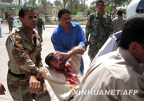 4月15日,在伊拉克迪亞拉省首府巴古拜市,伊拉克軍人和醫護人員搶救一名受傷的男子。伊拉克警方當天說,巴古拜市當天發生一起汽車炸彈襲擊事件,造成至少40人死亡、70多人受傷。新華社/法新