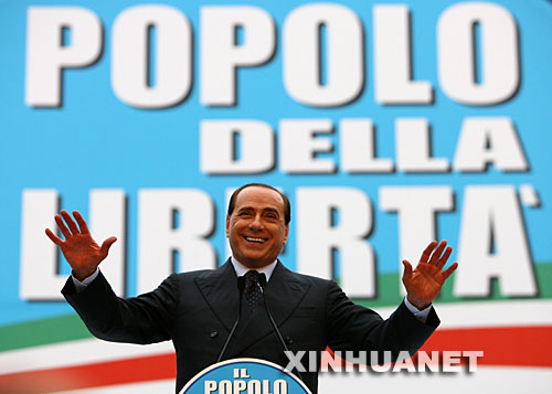 4月14日公布的選舉初步結果顯示,由意大利前總理貝盧斯科尼領導的中右聯盟在4月13日和14日舉行的議會選舉中,以明顯優勢戰勝由前羅馬市長韋爾特羅尼領導的中左聯盟,重新奪回在兩年前大選中失去的執政權力。這是2008年3月8日貝盧斯科尼參加競選集會的資料照片。新華社發