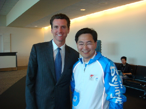 自那時起,我已去過舊金山四次,最近一次是在三年前和我的夫人、兒子一起去的。當時,我們參觀了舊金山市政廳,那里湊巧正在舉行一場婚禮,而且更巧的是,我們在那里碰到了舊金山市長紐森。我的兒子想要市長的親筆簽名,但是卻沒有帶筆記本,于是就順手拿了張舊金山的地圖請市長簽名。在給我兒子簽名的時候,紐森市長始終面帶笑容。昨天,當我與紐森再次相見,并和他說起三年前的這件事情時,他顯得非常高興,并和我拍了一張合影,以此來表現(xiàn)他對我兒子的美好祝愿。