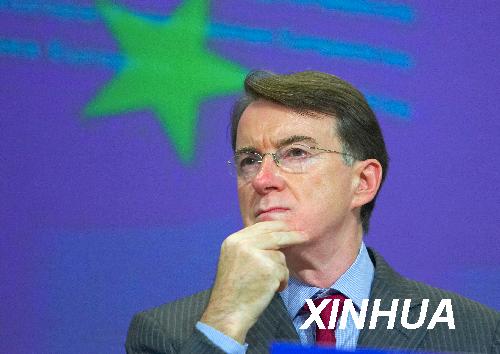 7月17日,在位于比利時布魯塞爾的歐盟總部,歐盟貿易委員彼得·曼德爾森出席記者招待會。曼德爾森表示,世界貿易組織多哈回合談判取得突破的機會在增加,但定于下周在瑞士日內瓦舉行的部長級會談將會非常艱苦。新華社記者徐金泉攝