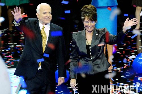 9月4日,美國共和黨總統候選人、亞利桑那州國會參議員麥凱恩(左)和他的競選搭檔、阿拉斯加州女州長佩林在圣保羅舉行的美國共和黨全國代表大會上向支持者致意。當日,麥凱恩在共和黨全國代表大會上正式接受了美國總統候選人提名。新華社記者張巖攝