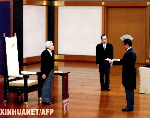 9月24日,在日本東京皇宮舉行的認(rèn)證儀式上,新當(dāng)選的日本首相麻生太郎(右)接受明仁天皇(左)的任命書(shū)。麻生太郎的前任福田康夫(中)出席了認(rèn)證儀式。新華社/法新