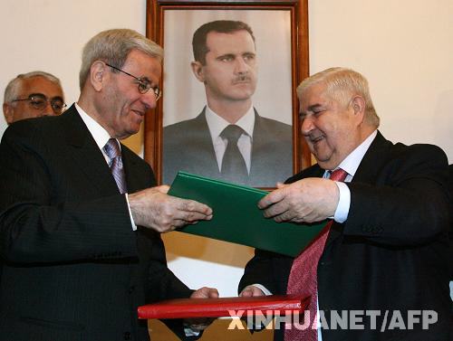 10月15日,在敘利亞首都大馬士革,敘利亞外長穆阿利姆(右)與黎巴嫩外長薩盧赫簽署聯合文件,宣布兩國正式建立外交關系。新華社/法新
