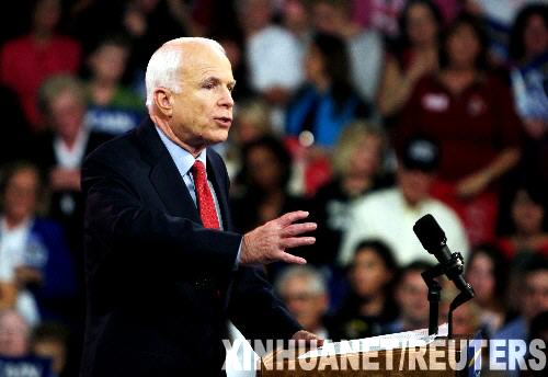 10月14日,美國共和黨總統(tǒng)候選人麥凱恩在賓夕法尼亞州舉行的競選集會上發(fā)言。麥凱恩當天提出一系列新經(jīng)濟政策主張,旨在減輕退休人員、證券持有者和需要償還房屋貸款者的負擔,以期與目前支持率領先的民主黨對手奧巴馬爭奪在經(jīng)濟議題上的主導權。新華社/路透