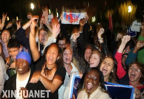 中國日報網環球在線消息:北京時間11月5日中午,美國民主黨總統候選人奧巴馬當選第56屆美國總統,這位47歲的黑人成為美國歷史上第一位黑人總統和首位非洲裔總統。