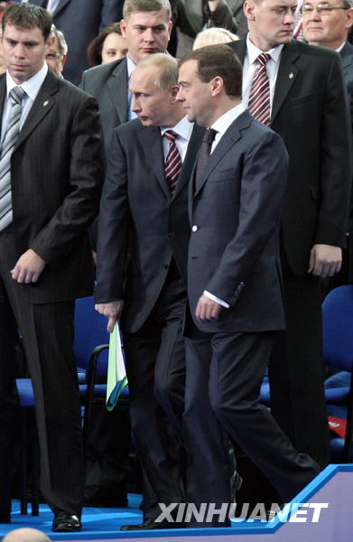 11月20日,俄羅斯總統梅德韋杰夫(前右)與俄總理普京(中)共同步入會場。當日,統一俄羅斯黨在莫斯科召開第十次代表大會。新華社記者沈伯韓攝