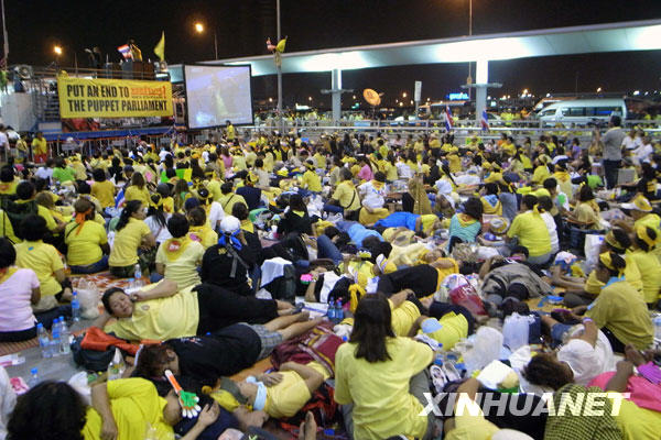 11月26日,泰國反政府人民民主聯(lián)盟成員繼續(xù)在泰國首都曼谷素萬那普國際機場集會。當天,因泰國反政府人民民主聯(lián)盟示威集會而自25日晚間關閉的素萬那普國際機場依舊保持關閉狀態(tài),大量乘客滯留。新華社記者凌朔攝