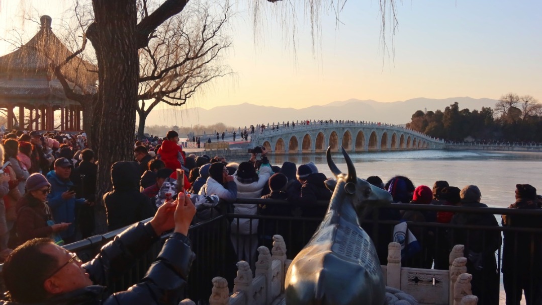 2025年12月21日是冬至節(jié)氣,北京頤和園十七孔橋的“金光穿洞”景觀吸引了眾多游客與攝影愛好者觀賞拍攝。