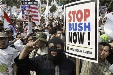 在印尼首都雅加達,約1萬名來自伊斯蘭政黨和宗教團體的民眾舉行了大規?棺h集會。人們揮舞著標語,高呼布什為“戰犯”和“恐怖分子”。西爪哇省有數百名學生在街上燃燒輪胎,高舉反布什標語,混亂狀況一度造成交通堵塞。