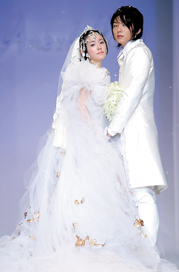 畢竟是以婚紗設計聞名的安德烈-金,兩位主角最后演繹的壓軸婚紗讓人們見識到了大師的功力。李俊基的奶白色絲質禮服與韓志敏的華麗婚紗搭配,顯現(xiàn)了安德烈·金極力展現(xiàn)的夢幻與浪漫